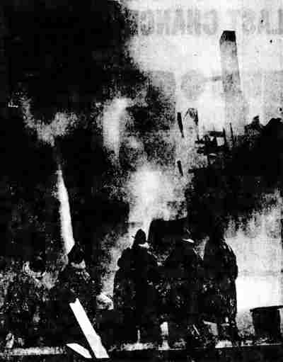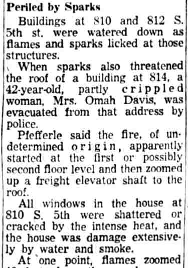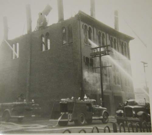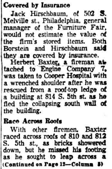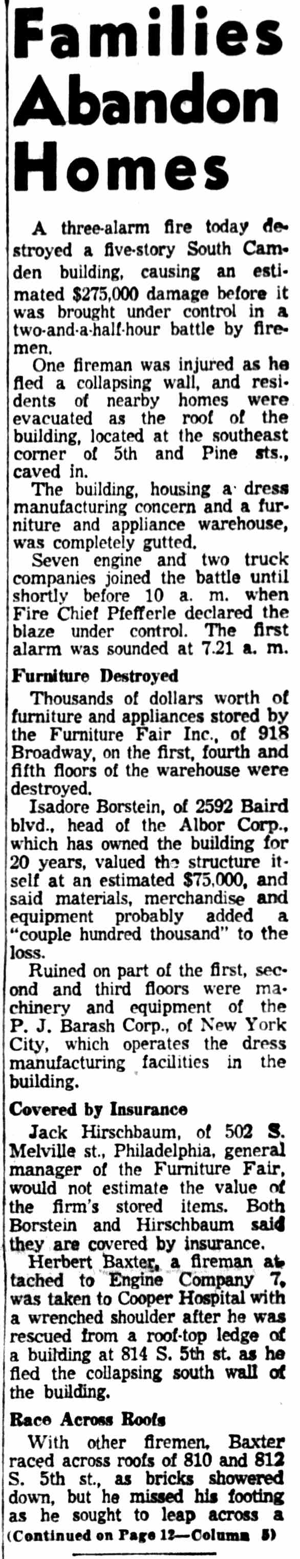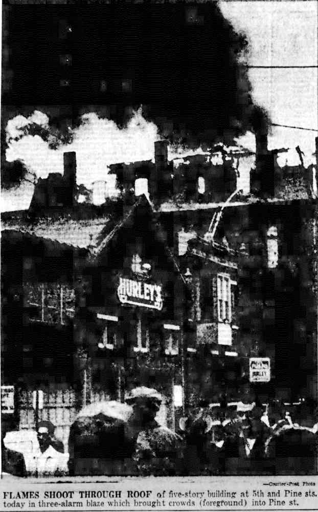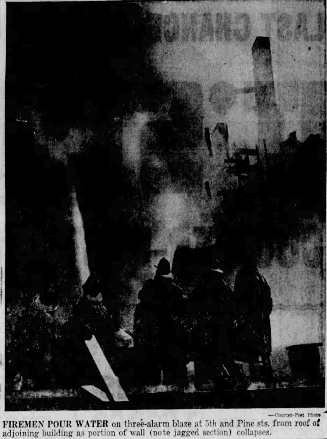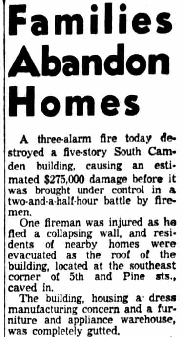 Camden Courier-Post October 27, 1956 Flames shoot through roof of building at 5th and Pine Streets today in three-alarm blaze which brought crowds into Pine Street