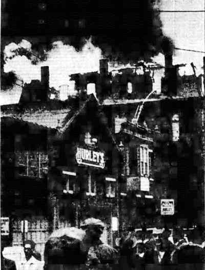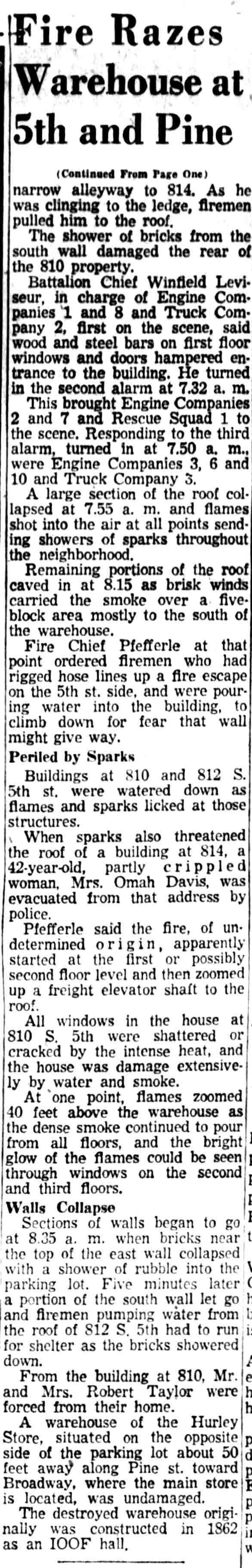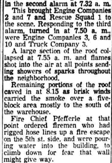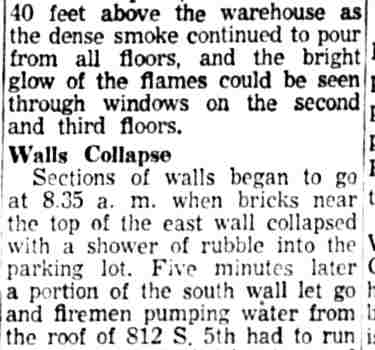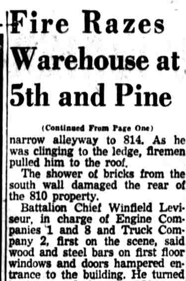 Firemen pour water on 3 alarm blaze at 5th and Pine Streets from roof of adjoining building as portion wall collapses.