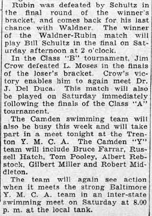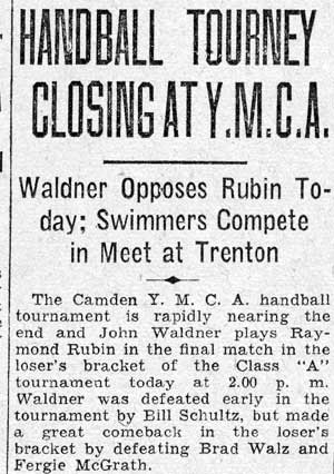 HANDBALL STARS IN CRUCIAL MATCHES The handball tournament of the Camden Y. M. C. A. will near a conclusion this afternoon, when two matches are scheduled to be played. Bill "Fergie" McGrath and Bill Schultz, both Camden policemen, meet in the final game of the winners' bracket, at 1 o'clock, while Frank Finn and John Waldner meet in the final game of the losers' bracket just as soon as McGrath and Schultz finish their match. The winners of the two matches will clash for the championship in 'the near future. The court at the "Y" has been completely renovated, new walls having been erected and a new floor laid. |