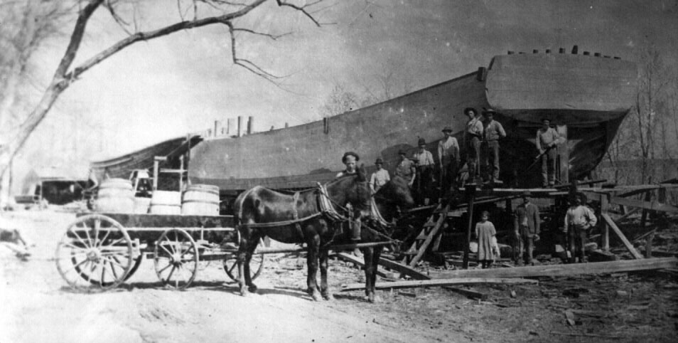 The photograph below, probably from the 1880s or early 1890s, shows what may be the construction of a boat on land near the drydock (when the drydock was empty of water in the winter or spring). The boats seem large for canal boats, so it is equally possible that this picture may show construction at an early incarnation of the Noecker, Rickenbach, and Auk Shipbuilding Company at Cramer Hill, Camden, NJ. If so the photograph would probably have been taken between 1897 and 1908.