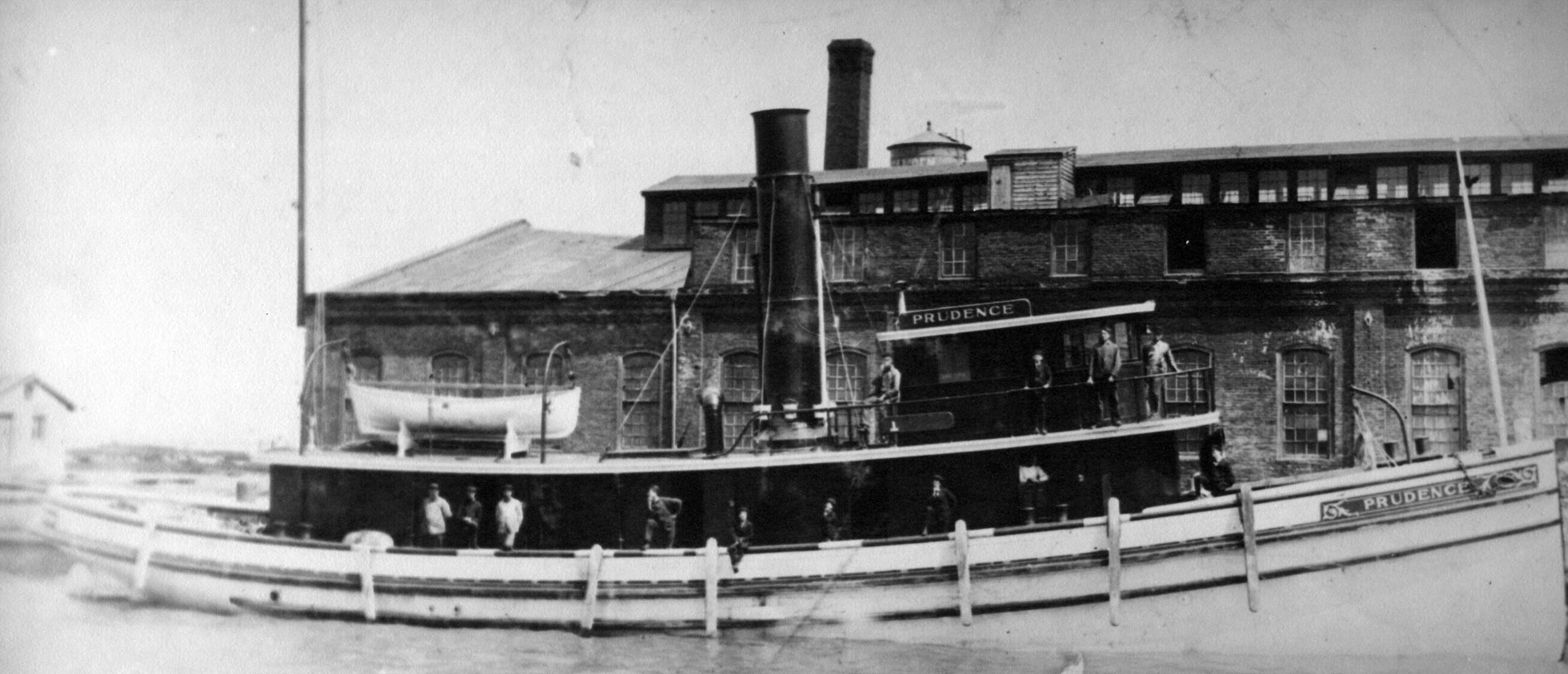 Below is a view of what might be the shipyard, with the steamboat "Prudence" in the foreground. Behind the brick factory is a watertower on which may be written "Camden". If so, this would strongly suggest that it is actually the shipyard.