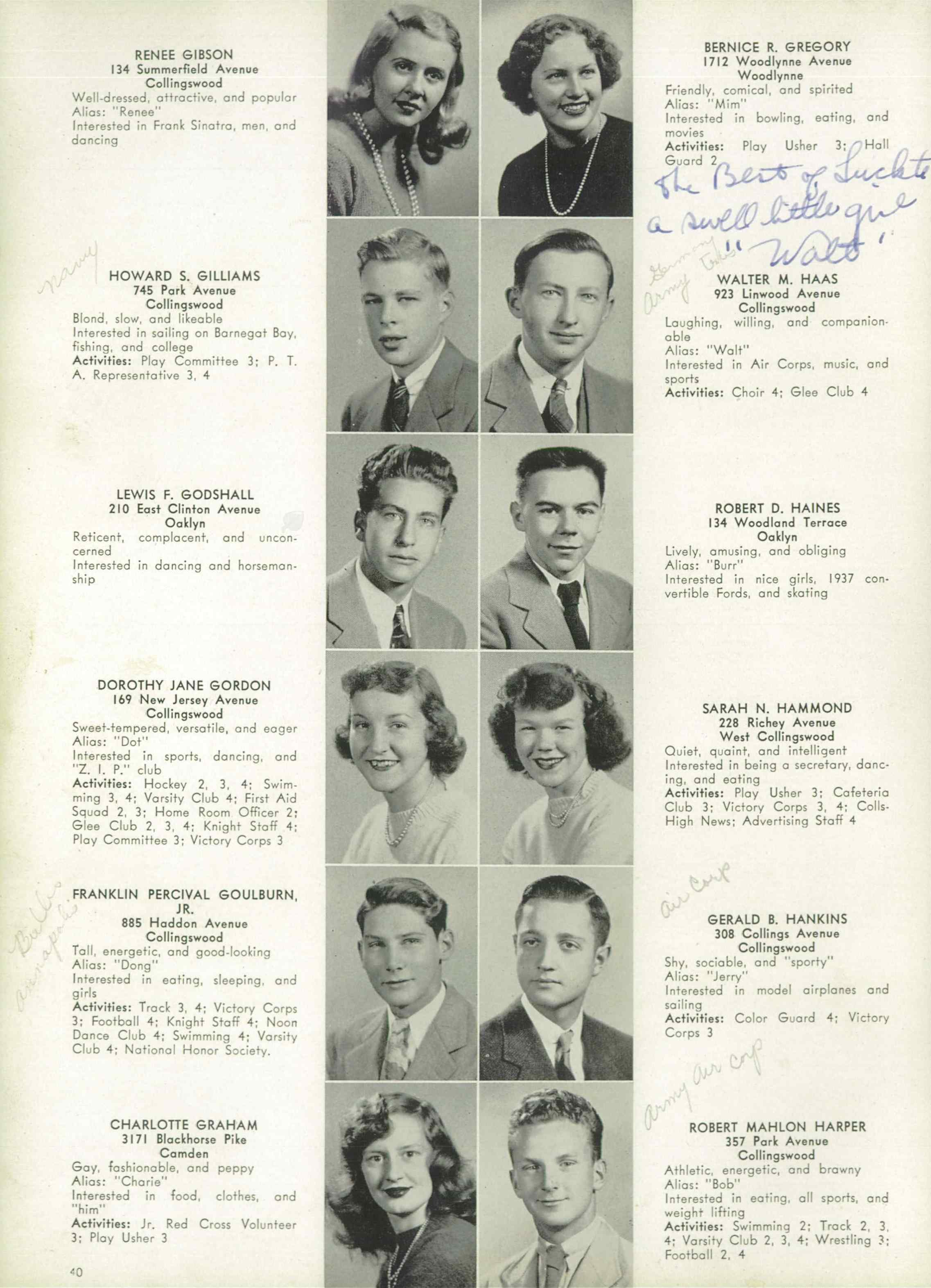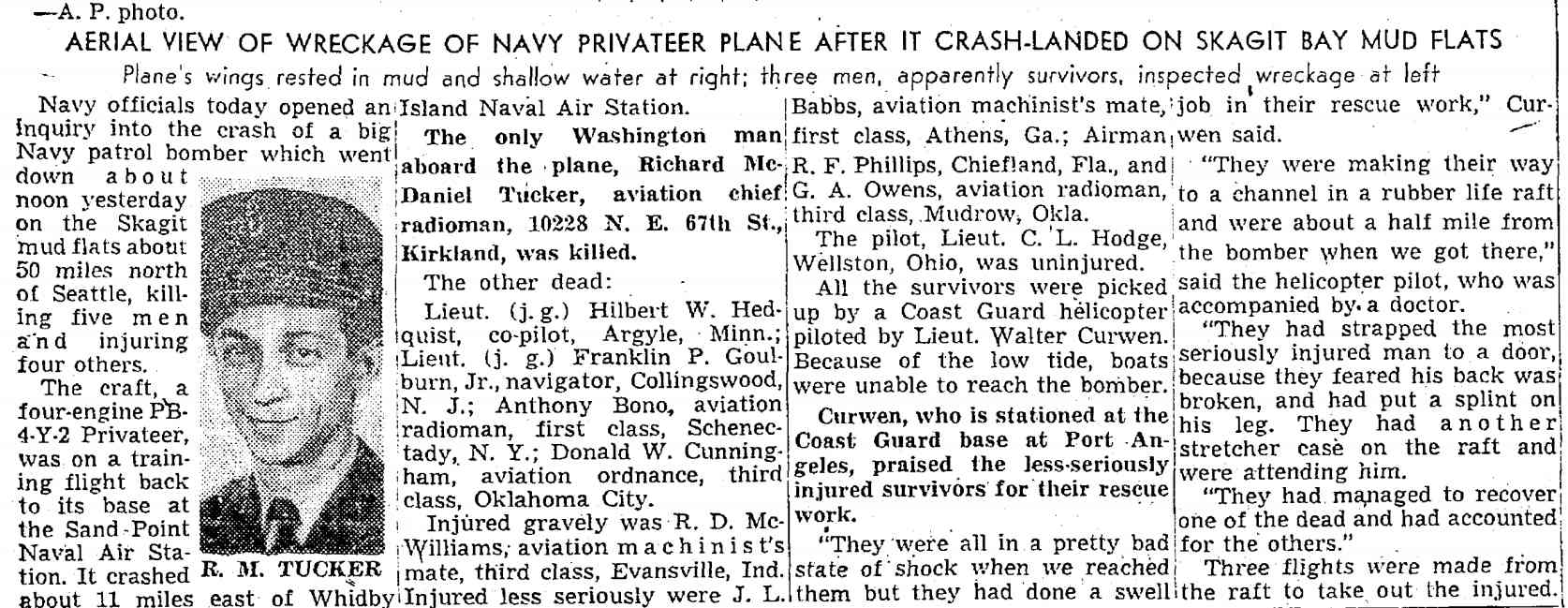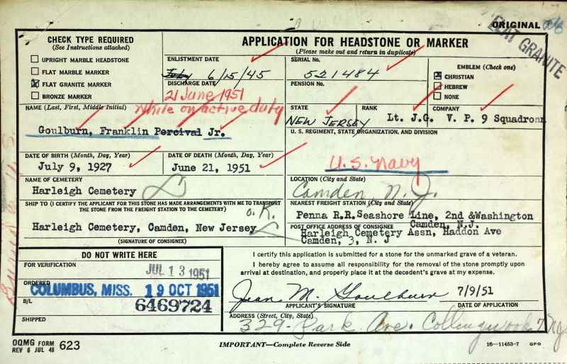 LIEUTENANT JUNIOR GRADE FRANKLIN PERCIVAL GOULBURN JR. was born in New Jersey to Franklin Percival Goulburn and his wife, the former Katherine R. Tatem on July 9, 1927. A younger brother, William, was born a bit more than two years later. The 1930 Census shows the family in Atlantic City, where the elder Goulburn worked as a district supervisor for the telephone company. Sadly, his father, who had been in ill health, died on June 29, 1933. Kathryn Goulburn returned to the Collingswood, New Jersey area where she had grown up, and began teaching and coaching sports in Merchantville. The 1940 Census shows the family living at 214 Mansion Avenue in Audubon. They later moved to 314 Maple Avenue in Collingswood. Franklin P. Goulburn graduated from Collingswood High School in 1944. He was an excellent student, graduating as a member of the National Honor Society, and a fine athlete, and was a member of Collingswood's track, football and swim teams. His success in high school was reward with an appointment to the United States Naval Academy. A member of the Academy's Class of 1949, he was a member of the swim team in 1947, 1948, and 1949, and was the team captain in his senior year. At one point during his career at Annapolis, he competed in swimming with his brother William, who was attending Dartmouth University. Franklin P. Goulborn was commissioned as an Ensign on June 3, 1949. He qualified for flight duty, and was trained as a navigator. Franklin P. Goulborn was later promoted to Lieutenant Junior Grade. He also married at some point, most likely after graduating from the Naval Academy. He was assigned to the newly formed Patrol Squadron 9 (VP-9), based at the Sand Point Naval Air Station near Seattle, Washington. On April 29, 1951 the Seattle Daily Times reported that his wife Jean gave birth to a son, Franklin P. Goulburn III at Fort Lawton Hospital. Patrol Squadron 9 flew the Consilidated PB4-Y2 Privateer bomber. This aircraft was a naval version of the B-24 Liberator bomber, which had played a vital role during World War II as a long range heavy bomber. Lieutenant Junior Grade Franklin P. Goulburn Jr. was killed on June 21, 1951 along with four other men when his plane crashed in the Skagit Bay tidal flats at the north end of Camano Island, about 50 miles north of Seattle and 11 miles east of Whidbey Island Naval Air Station. He was survived by his wife, son, mother, and brother. Lieutenant Junior Grade Goulburn was brought home to New Jersey and was buried at Harleigh Cemetery in Camden, New Jersey. His mother, Katherine Tatem Goulborn was elected to the Collingswood High School Hall of Fame in 1991. She had graduated from Collingswood High School in 1920, recognized for both her excellent scholarship and athletic ability. An outstanding goalie in field hockey, she went to Trenton Normal School, where she received a teaching degree. After working in Merchantville, she took a position with the Collingswood school system in 1945, remaining there until she retired in 1964. Thirteen of these years were as board secretary. |