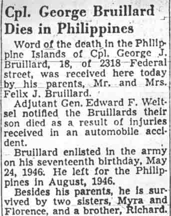 CORPORAL GEORGE J. BROUILLARD was born on May 24, 1929 to Felix Joseph and Florence Brouillard. The Brouillard family lived at 2318 Federal Street in Camden NJ. George Bruillard enlisted in the United States Army on his 17th birthday. After basic training, he was sent to the Philippine Islands. Corporal George Brouillard died in the Philippines as a result of injuries suffered in an automobile accident on January 20, 1948. His death was reported in the Camden Courier-Post on January 24, 1948. He was survived by his parents, sisters Myra and Florence, and brother Richard Brouillard. George Brouillard was brought home to New Jersey in March of 1948. He was buried at Beverly National Cemetery in Beverly NJ on April 8th of that year. He lies near his parents, his father having also served in the Army, reaching the rank of Technical Sergeant. |