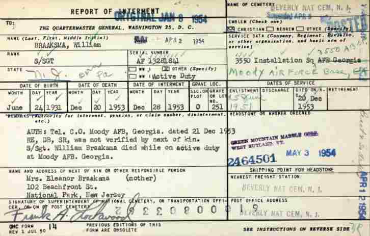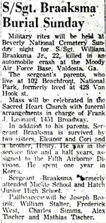 STAFF SERGEANT WILLIAM BRAAKSMA was born to William and Eleanor Braaksma on June 24, 1931. His father worked as a toolmaker. The Braaksma family lived in Camden's Eighth Ward in the 1930s and 1940s. The family was living in Pine Hill when the 1940 Census was taken. They returned to Camden after the Census was taken and were still there as late as 1947, living at 552 Chelton Avenue in 1943 and later at 428 Van Hook Street and 1722 Ferry Avenue. William Braaksma grew up in this neighborhood, and attended the Mickle Elementary School at 6th and Van Hook Streets, and later Cooper B. Hatch Junior High School on Park Boulevard. By 1953 the family had moved to National Park, New Jersey. William Braaksma left school and joined the United States Air Force as soon as he turned 17. He re-enlisted in the United States Air Force on June 20, 1951. During his time in the Air Force, he was stationed for one year in Korea. William Braaksma Jr. was killed in an automobile accident at Moody Air Force Base in Valdosta GA on December 20, 1953. His body was returned to New Jersey, and after a Mass at Sacred Heart Roman Catholic Church, he was taken to Beverly National Cemetery in Beverly NJ for burial. William Braaksma Jr. was survived by his parents, who had moved to National Park NJ by the end of 1953, his brother Henry, and two sisters, Eleanor T. and Cori Braaksma. |