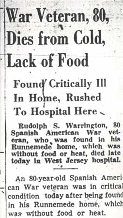 Rudolph Sylvester Warrington was born on September 1, 1870 to Benjamin I. Warrington and his wife, the former Mary K. Birdsell. His maternal grandfather was Dr. Sylvester Birdsell, a well-known physician in Camden. By 1880 his father had passed, and Rudolph Warrington was living with his mother, brother B. Laird, and sister Mary at the home of his grandfather, 614 South 5th Street in South Camden. This would be his home address through the 1900 Census. He had, however, joined the United States Navy while in his teens. By the time the 1890 Camden City Directory was published, his father had died, and his mother was living at 757 Spruce Street in Camden NJ with his brother Laird B. Warrington, then a shoemaker. Rudolph S. Warrington made a career of the United States Navy. He was a veteran of the Spanish-American War, serving aboard a gunboat, the USS Wilmington. Remaining aboard the Wilmington, he was with the ship during its journey to South America and its trip up the Amazon River. When the Census was taken in 1900, Rudolph Warrington, the Chief Master at Arms, was with the Wilmington in Montivideo, Uruguay. Rudolph Warrington was still on active duty as late as the summer of 1910. He then was stationed aboard the old USS Independence, then docked at the Mare Island Navy yard in California, where it was being used as a receiving ship. The USS Independence was disposed of a few years later. Rudolph Warrington had not returned to Camden when the 1914 Camden City Directory was compiled. By January 1920, Rudolph Warrington had retired from the service with he rank of Chief Master at Arms. He had returned to Camden and was living with his mother, Mary Warrington, at 757 Spruce Street. He had briefly married around 1916, but he was a widower at the time of the census. Ten years later, Rudolph S. Warrington was still living at 757 Spruce Street in Camden. His mother had passed, and he was renting an apartment. Rudolph Warrington lived alone, save for a housekeeper, Amy Yetter. Rudolph Warrington apparently fell on hard times afterwards. He had moved to 64 Oakland Avenue in Runnemede NJ, where he lived by himself. Missed by neighbors in March of 1950, he was discovered alone in the home, which had no food or heat. He was rushed to West Jersey Hospital on March 22, 1950, where he died. Chief Warrington was buried at Beverly National Cemetery on March 27, 1950. |