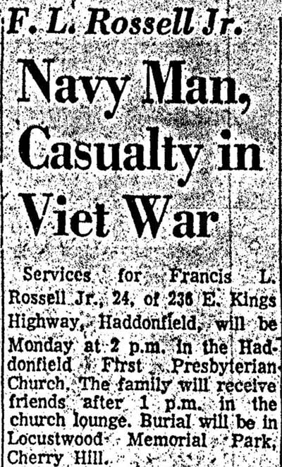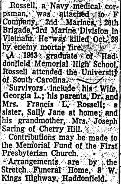 Navy Corpsman Killed in Vietnam Navy Medical Corpsman 3/C Francis L. Rossell Jr., 24, formerly of Haddonfield, N.J. was killed October 28 during a helicopter rescue mission in Vietnam, the Defense Department reported Thursday. Corpsman Rossell, who was sent to South Vietnam in July, was a graduate of Haddonfield High School and had attended South Carolina University. |