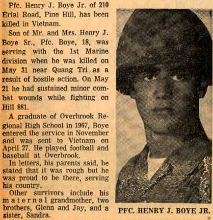 Henry J. Boye Jr. served as an 0331 in the Marine Corps, and reached the rank of PFC/E2. He was slightly wounded in the fighting on Hill 881 on May 21, 1968. On