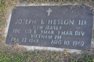 PRIVATE FIRST CLASS JOSEPH LEONARD HESSON III Joseph Leonard Hesson III was born on February 22, 1949, to Joseph and Dolores Hesson. Joseph was born in Camden, before his parents moved to Pennsauken. While attending high school he was a member of the track and swimming team. He graduated from Camden County Vocational School June 1967. He had a girlfriend named Kathy Hodur that called him"carrot top".After graduating from