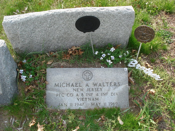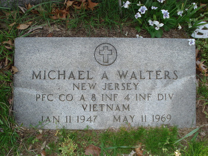 MICHAEL ARTHUR WALTERS was born on January 11, 1947 to John S. and Mary A. Walters. His hometown of record was Gloucester City, New Jersey where he attended St. Mary's Roman Catholic Church. Michael Walters was unmarried when he was sent to Vietnam. His family lived at 400 Market Street in Gloucester City. After being drafted into the Army, Michael Walters underwent basic training and was assigned to the 4th Infantry Division. He began his tour of duty in Vietnam on April 18, 1969. Private First Class Michael Arthur Walters was killed in action at Pleiku on May 11, 1969 that took the lives of five other men in his company as well, Private First Class Robert Gary Koval, Fairmont, WV; Private First Class Terry Kay Maready, Okemah, OK; Specialist 4th Class Charles Thomas Neal, Atlanta, GA; Specialist 4th Class Richard Manuel Paco, Pacolma, CA; and Private William Henry Swanson, Nashville, TN. |