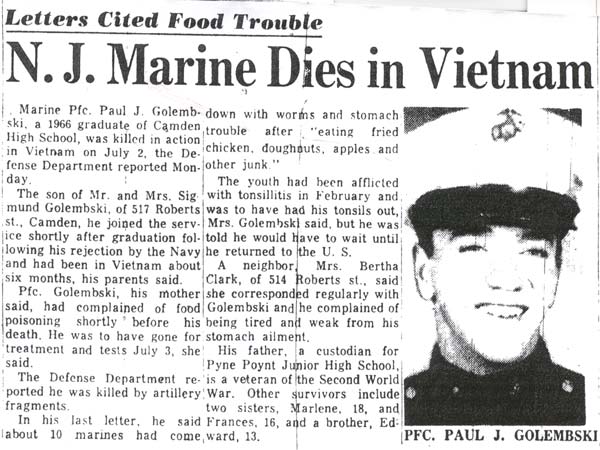 PRIVATE FIRST CLASS PAUL JOSEPH GOLEMBSKI was born in Camden NJ on October 12, 1947 to Mr. and Mrs. Sigmund Golembski. The family lived at 517 Roberts Street in South Camden. His father worked as a custodian at Pyne Point Junior High School in North Camden.Paul Golembski enlisted in the United States Marine Corps shortly after graduating from Camden High School in June of 1966. After training as a rifleman, he was sent to Vietnam.Paul Golembski was killed in action by enemy artillery on July 2, 1967 in Quang Tri province, Vietnam. He was survived by his parents, sisters Marlene and Frances, and a brother, Edward. |