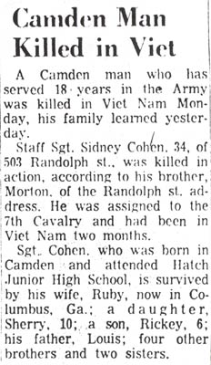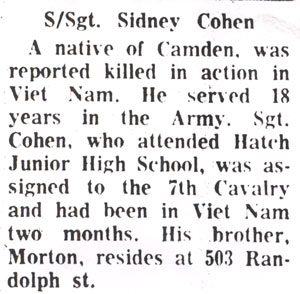 STAFF SERGEANT SIDNEY COHEN was born on January 27, 1931 to Louis Cohen and his wife, the former Rose Myeroff. He grew up in the 400 block of Liberty Street in Camden NJ, alongside four older brothers, Irving, David, Norman "Nunny", and Morton "Porky"; one younger brother, Robert; and two sisters, Pearl and Sissy. He had attended Cooper B. Hatch Junior High School on Park Boulevard in the Parkside section of Camden prior to enlisting in the Army. His special interests were baseball, bowling, cooking and gambling.Sidney Cohen enlisted in the US Army in 1949 from his hometown of Camden, NJ. He attained the rank of Staff Sergeant. As a career soldier, he served around the world, including stints in the United Kingdom and Hawaii, before going to Vietnam. His MOS was 11B40, infantry non-commissioned officer. Army records available from the National Archives indicate that he had been awarded the Bronze Star prior to his service in Vietnam, most likely in Korea.Staff Sergeant Cohen served with C Company, 1st Battalion, 7th Cavalry Regiment, 1st Cavalry Division. He was killed in action in the fighting at Ia Drang Valley on November 15, 1965 when he was shot in the chest. Sidney Cohen was the first Camden, NJ resident to be killed in Vietnam. Also lost that day was Private First Class George J. Stephens of Camden, New Jersey, a member of C Company, 2nd Battalion, 7th Cavalry Regiment.Staff Sergeant Sidney Cohen was awarded the Purple Heart, the Bronze Star w/ V for Valor, the Good Conduct Medal, the National Defense Medal, The Army of Occupation Medal, The Combat Infantry Badge, The Military Merit Medal of the Republic of Vietnam and the Gallantry Cross w/Palm of the Republic of Vietnam.Staff Sergeant Sidney Cohen was survived by his wife Ruby Mae and children Ricky and Sherry. |