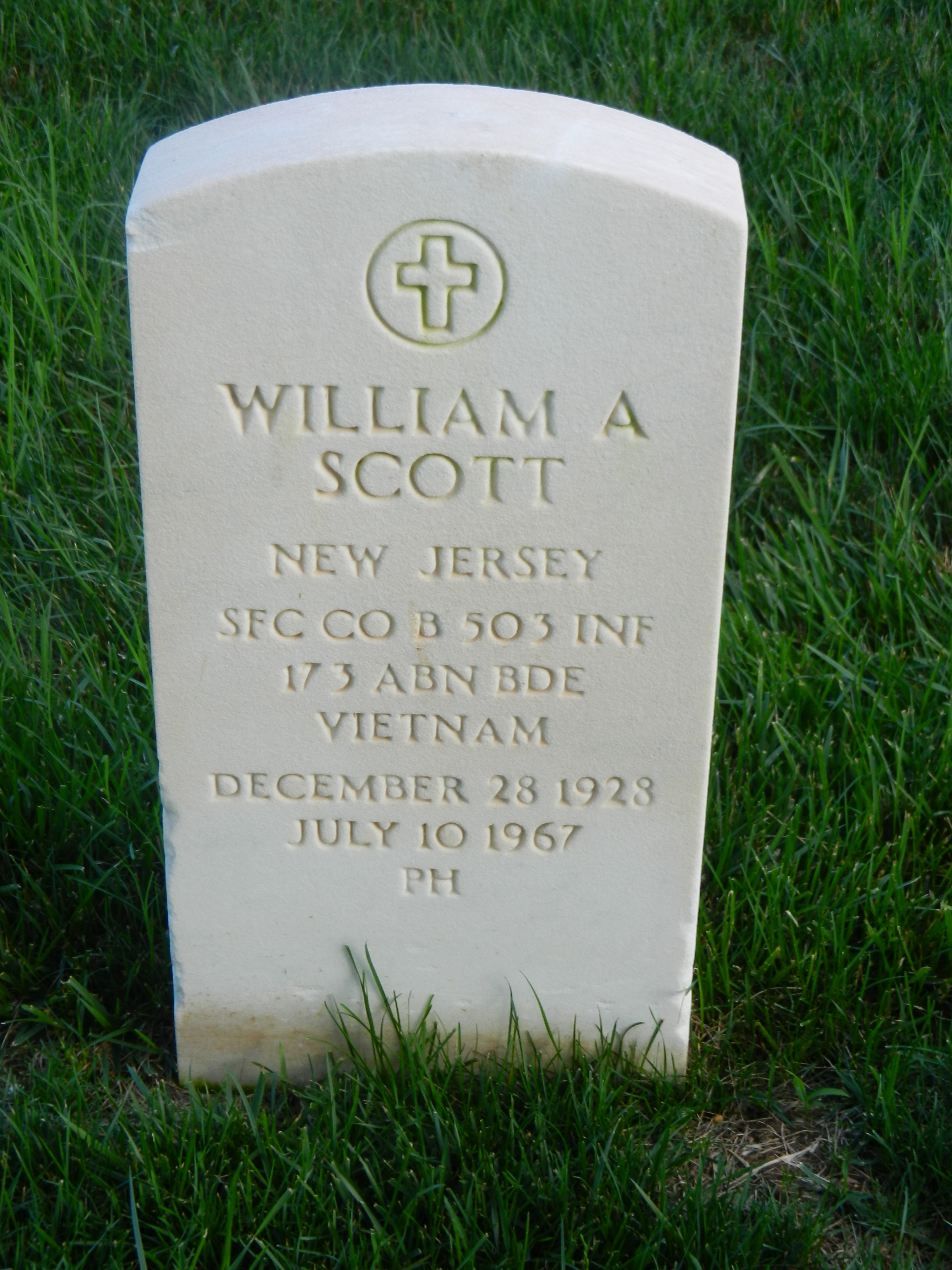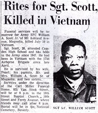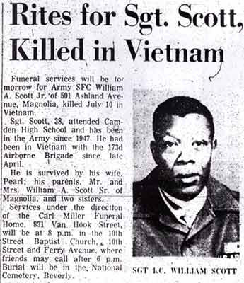 SERGEANT FIRST CLASS WILLIAM A. SCOTT JR. was born on December 28, 1928 in West Virginia to William and Lenora Scott. He was the third child, coming after sisters Nettie L. and Florence Scott. The family was living in Fayetteville VA in April of 1930, in a small, unincorporated town known as Cunard.The Scott family came north and settled in Camden NJ by the 1940s. William A. Scott Jr. attended Camden High School. He joined the United States Army in 1947. At that time his family was living at 1884 South 10th Street, in Camden's Centerville section. William A. Scott Jr. had been promoted to the rank of Sergeant by the summer of 1953. He was then serving with the 7th Infantry Division in North Korea when on July 8 he was wounded by a rocket. After a brief hospitalization he returned to duty on August 12. His Military Occupational specialty at that time was 01745 Light Weapons Infantry Leader A career soldier, William A. Scott Jr. had been promoted to the rank of Sergeant First Class by 1967. His military occupation specialty (MOS) is listed as 11F4P Infantry Operations and Intelligence Specialist. Sergeant Scott began his tour of duty on April 24, 1967. He was serving with Headquarters Company, Fourth Battalion, 503rd Infantry Regiment (Airborne), 173rd Airborne Brigade, when he was killed in action by small arms fire in Kontum Province, Vietnam, on July 10, 1967. Sergeant First Class Scott was brought home and buried at Beverly National Cemetery in Beverly NJ on July 21, 1967. He was survived by his wife, Pearl Scott, his parents, who had moved to Magnolia NJ, and two sisters. |