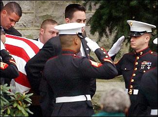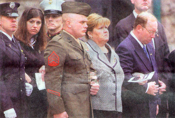 City Marine Mourned Jim Goldschmidt didn't know Cpl. Marc Ryan. "I wanted to be here, and I thought it was important for my grandson to be here," Goldschmidt said, his arm around his 10-year-old grandson Fred. He was far from the only Gloucester City resident at the fallen Marine's funeral on a cold and cloudy Tuesday afternoon. Many of the dozens of others who stood outside St. Mary's Roman Catholic Church didn't know Ryan, who perished Nov. 15 after an explosion in Ramadi, Iraq. But they were there to mourn the passing of a hero and celebrate his life. "Mark was a man that put his nose to the grindstone," the Rev. Gary Brennan said through speakers outside the stone church. "He did what needed to be done. We know Marc gave all. He could do no less." The 25-year-old former Gloucester City High School football player was in Iraq by choice. Having served two tours in Afghanistan and two in Iraq, he could have returned home. Instead, he chose to serve a third tour. Ryan, a member of the 2nd Battalion, 4th Marine Regiment, 2nd Division, returned to Iraq so "maybe just one child will live," Brennan said. "This Marine laid out his life for you, for me, for the child he didn't know." To serve his country was in Ryan's blood - his father and grandfather were also Marines. He enlisted after two years at Wesley College in Dover, Del., where he majored in education. He planned to become a policeman after returning from Iraq. "There can be no greater image of courage than Cpl. Marc Ryan," New Jersey acting Gov. Richard J. Codey said. "Cpl. Ryan gave his life to protect us. We can never, ever repay him for his sacrifice and we can never repay his parents, his siblings, for their loss. At 25 years old, he showed greater courage and strength than most people will ever be asked to show." Blocks from the church, people gathered outside storefronts and houses decorated with American flags and yellow ribbons waiting for the funeral procession. In every community between Gloucester City and Ryan's final resting place at the Garden of Honor Mausoleum at the Harleigh Cemetery in Camden, people stood and saluted as the hearse carrying Ryan's flag-draped coffin passed by. "I know there is one thing he wanted us all to do," Brennan said. "To continue to pray for the men and women that are still in Iraq today." |