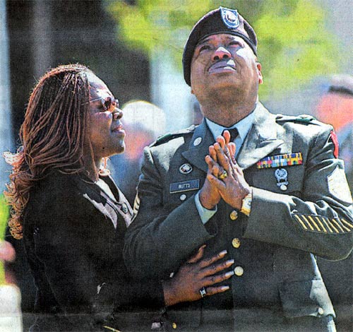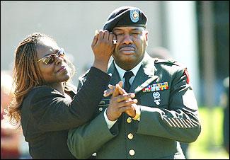 Army Staff Sergeant Ronnie Butts of the Pennsylvania National Guard is comforted by fiance Gail Howard at Sergeant First Class Michael Egan's burial in Cherry Hill Tuesday. |
