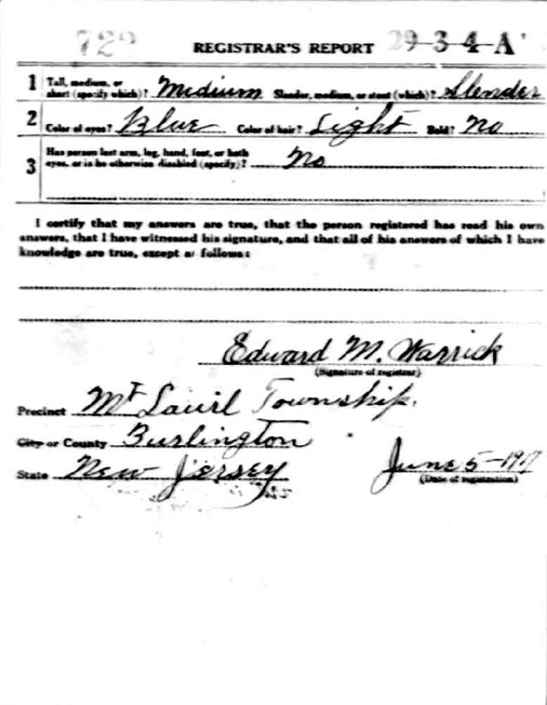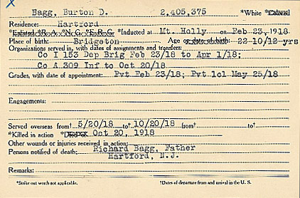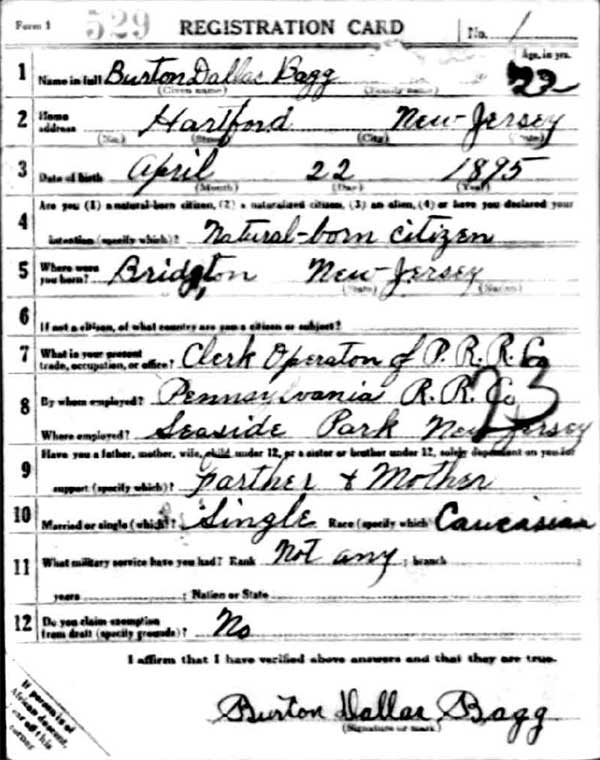 PRIVATE FIRST CLASS BURTON DALLAS BAGG was born in Bridgeton NJ on April 22, 1895 to Mr. and Mrs. Richard D. Bagg. The elder Bagg was a florist. The family had moved to a house on Hartford-Medford Road in the Hartford section of Mt. Laurel Township NJ sometime after June of 1900. Besides Burton there were at least five other children, Bessie, William, Katherine, Mary, and John. Burton Bagg registered for the draft on June 5, 1917. At that time he was living with his mother and father in the Hartford section of Mt. Laurel Township NJ. He was employed as an operations clerk by the Pennsylvania Railroad at Seaside Park NJ. Assigned to Company A, 309th Infantry Regiment, Private First Class Bagg was killed in action while serving in France on October 20, 1918. Prior to joining the military, Burton Bagg been a member of the Ottawa tribe of the patriotic fraternal organization, the Improved Order of Red Men, and his name was inscribed on the war memorial that group had erected at Pulaski Park on Haddon Avenue. The monument was moved in 1981 to Tuckerton NJ, where it stands today. Private Bagg's mother was still living in Mt. Laurel as late as 1930, when she registered to make the government paid for pilgrimage to her sons final resting place in France.. |