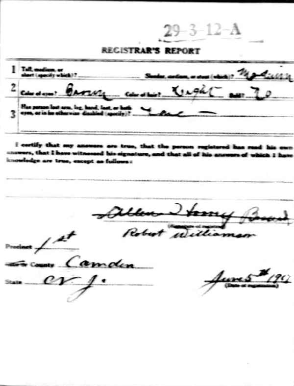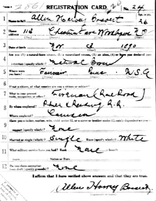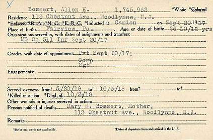 SERGEANT ALLEN HARVEY "DEWEY". BOSSERT was the son of William H. and Mary Bossert. He was born in Fairview, Pennsylvania on November 4, 1890. The Bossert family moved to 113 Chestnut Avenue, Woodlynne NJ sometime after 1902. His father worked as an inspector on one of the railroads. Allen Bossert was working as a fireman with the Philadelphia & Reading Railroad when he registered for the draft in June of 1917. Allen Bossert was inducted into the United States Army on September 20, 1917 at Camden. He was assigned to the Machine Gun Company of the 311th Infantry, and went overseas with his unit in May of 1918. During his time in service he was promted from Private to Corporal and then to Sergeant. Sergeant Bossert was killed by shrapnel on October 3, 1918. At the time of his death he was about to be sent to school to study for a lieutenancy. Sergeant Bossert was the only man from Woodlynne to make the supreme sacrifice. |