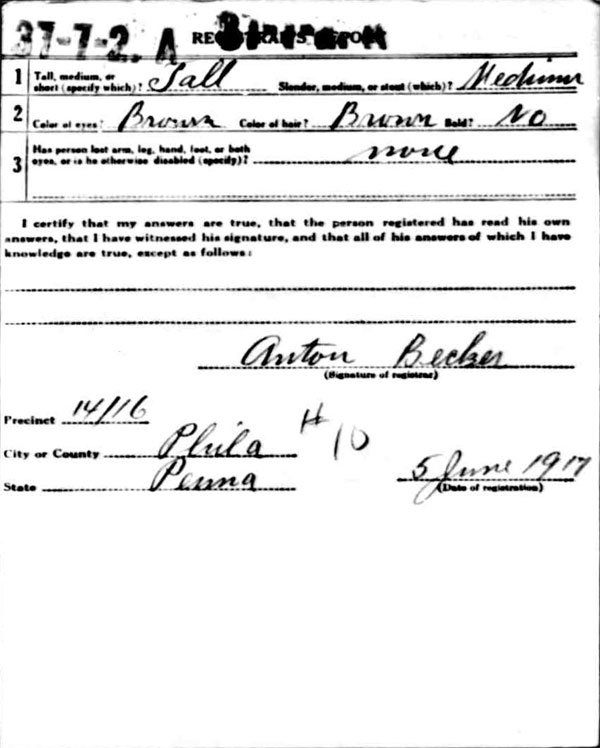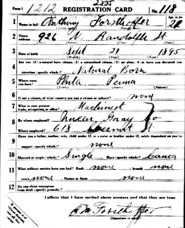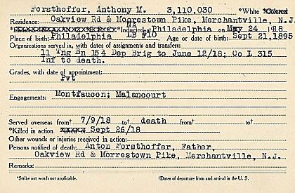 PRIVATE ANTHONY MICHAEL FORSTHOFFER was born in Philadelphia, Pennsylvania on September 25, 1895 to Anthony and Anna Forsthoffer. The Forsthoffers were German-speaking immigrants from what was then the empire of Austria-Hungary. The family lived on Randolph Street in Philadelphia through at least the summer of 1910. The elder Forsthoffer owned his own blacksmith shop. Anthony Forsthoffer lived in the Merchantville Grove neighborhood of Pennsauken NJ during the 1910s, on what is now called Oakview Avenue at Maple Avenue. On June 5, 1917, he registered for the draft in Philadelphia PA. He was then living at 926 North Randolph Street in Philadelphia, and working as a machinist at 618 Chestnut Street. He had been a member of the Knights of Columbus and the Foresters of America organizations. Anthony Michael Forsthoffer was drafted on May 27, 1918. He was sent to Camp Meade MD, and assigned to the 315th Infantry Regiment. He went overseas with his unit on July 7, 1918. Private Forsthoffer was killed in action on September 26, 1918. His death was reported in the November 11, 1918 edition of the Camden Post-Telegram. He was buried at the Meuse-Argonne American Cemetery in Romagne, France. In 1930 Mrs. Anna Forsthoffer signed up for the government-paid Mother's Pilgrimage to her son's grave in France. A street was named for him in Pennsauken. At some point over time the name "Forsthoffer Avenue" became "Frosthoffer Avenue". |