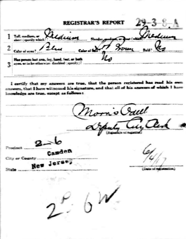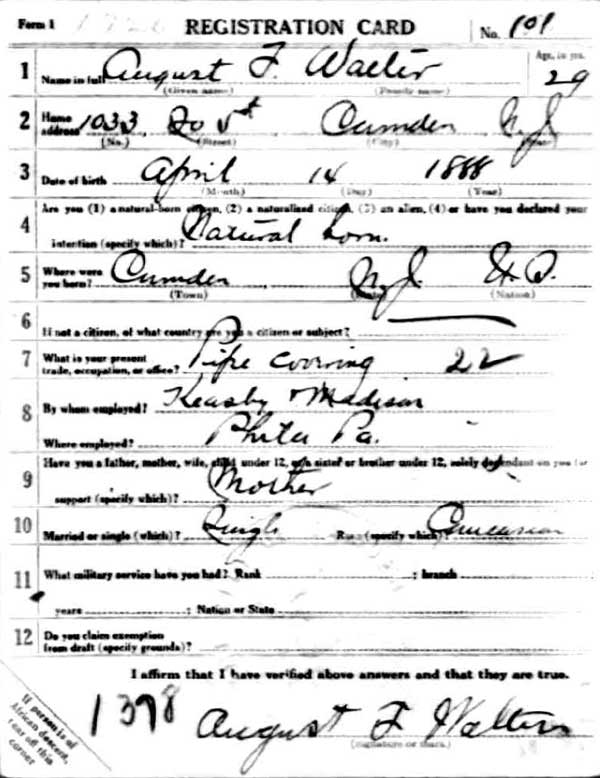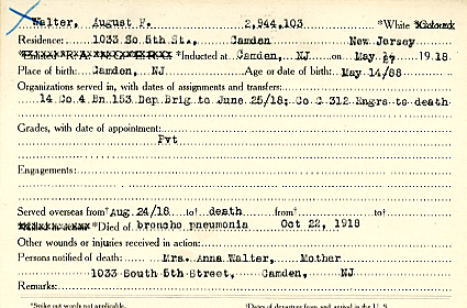 PRIVATE AUGUST F. WALTER lived at 1033 South 5th Street with his widowed mother, Mrs. Anna Walter and his grandparents, Frederick and Barbara Brum from the 1890s until he was inducted into the Army. At the time of the 1910 Census he worked as a pipe coverer, a trade he still followed in June of 1917 when he registered for the draft. Drafted at the age of 30, he was sent to Camp Dix, New Jersey on May 27, 1918. He left for France as a member of Company C, 312th Engineers. August Walters contracted pneumonia and died while serving in France on October 22, 1918. His mother survived him. The August F. Walter Chapter No. 4, Disabled American Veterans of the World War, which had its chapter home at 310 Broadway, was named in his memory. This chapter, which now meets at the VFW Post in Westmont, New Jersey, was still active in 2005. |