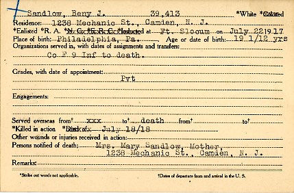 PRIVATE BENJAMIN SANDLOW was the son of Mary Sandlow, of 1238 Mechanic Street in Camden NJ. He enlisted in the United States Army on July 22, 1917. Sent to Fort Slocum NY, Benjamin Sandlow was assigned to Company F, 9th Infantry Regiment. Private Benjamin Sandlow was killed in action on July 18, 1918 at the beginning of the Allies major offensive. Initially declared missing in action, the Army changed his status to killed in action in July of 1919. Private Sandlow was survived by his father, who had passed away by January of 1920. He was also survived by his mother, brothers Louis, Carl, and Anthony, and sisters Della, Laura, and Charlotte. Another brother, John Sandlow, was born after Benjamin Sandlow had been killed. The family was still living on Mechanic Street as as late as April 1930. |