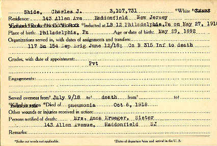 Shide died of pneumonia while serving in France on October 6, 1918.