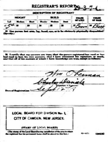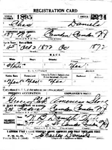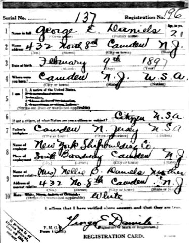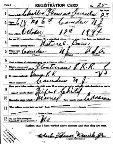 CHARLES THOMAS DANIELS was born around 1894 to Charles and Nellie B. Ross Daniels. He was born and raised in Camden NJ. When the Census was taken in 1900, the family was living at 513 Birch Street in North Camden. The Daniels family then consisted of three children, Charles, George, and baby Elizabeth. A fourth child had died, however, another brother, Samuel, would be born sometime after after 1900. Charles T. Daniels' father then worked as an oilcloth printer. The family moved a few years later to 609 Willard Street, and by 1910 to 621 Birch Street. Charles T. Daniels' father was still working as an oilcloth printer in 1910, but by 1914 was working as a clerk at the American Stores grocery at 800 Federal Street. The Daniels family lived at 615 Pearl Street when the 1914 Camden City Directory was compiled, and later moved to 507 North 6th Street in Camden NJ. By 1917 Charles T. Daniels had married. Charles T. Daniels, wife Florence, and their child lived at 618 North 6th Street when he registered for the draft on June 5, 1917. He had been working as a "floatman" for the Pennsylvania Railroad in Camden. Charles T. Daniels went to sea with his younger brother George E. Daniels, a cook, aboard an oil tanker, the SS Atlantic Sun, working in the ship's galley. When the Atlantic Sun was sunk by a German submarine on March 18, 1918, the Daniels brothers took to a lifeboat. The lifeboat was approaching the English shore when the high sea and surf capsized the craft, and Charles Daniels was drowned. His brother survived the sinking. Charles Daniels was 23 when he was killed, and besides his brother George left his wife Florence, parents Charles and Nellie B. Daniels, sister Elizabeth Daniels Morris, brother Samuel, and a nephew, George Morris, all of 507 North 6th Street, Camden NJ. They were all residing at 507 North 6th Street, along with Elizabeth's husband Ivin Morris and Nellie Daniels' father Clarence Ross in January of 1920. The Daniels family later moved to 945 Linden Street in North Camden. By 1930 Nellie Daniels was a widow. She was still living at 945 Linden Street, with unmarried sons George and Samuel, widowed brother John Ross, and his children, Nellie and Edward, when the 1930 Federal Census was enumerated. George Daniels later moved to 61 Marlton Avenue in east camden. Coincidentally, two more ships would carry the name, M.S. Atlantic Sun. The third Atlantic Sun was also the victim of a German submarine. One man from Camden, New Jersey was among those lost, Carlton Harris Strang. |