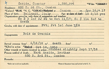 PRIVATE FIRST CLASS CHESTER ANZIDE appears to be the son of Emideo and Erena Anzideo, who in 1910 lived at 312 Division Street in Camden NJ. The elder Anzideo worked as a laborer at one of Camden's oil-cloth factories, while Mrs. Anzideo took in laundry. There were three children home at the time of the 1910 Census, Cesarino, aged 13, Nesto, aged 10, and Ferdinando, ages 6. There were also two younger step-children with the surname Dorisio. All the Anzideo boys were born in Italy and had come to America in 1905, with their mother. One of the older Anzideo sons enlisted in the United States Army, most likely the older son, Cesarino, under the name Chester Anzide. He enlisted in Company B, 3rd Infantry Regiment of the New Jersey National Guard on April 18, 1917 at Camden. On October 11, 1917 this unit was reorganized as the 114th Infantry Regiment and was attached to the 29th Infantry Division. The unit arrived in France in June of 1918. Private