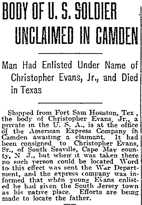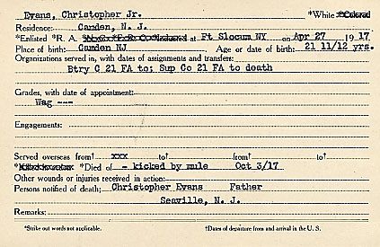 CHRISTOPHER EVANS JR. was born in Aril of 1896 to Christopher and Nellie Evans, probably in Stockton Township NJ, which became a part of Camden in 1899. The elder Evans had been living in the area of 29th and Saunders Streets in what is now East Camden in the 1880s and 1890s. When the Census was taken in 1900, the Evans family, which included a younger brother, John, lived at 3065 Cleveland Avenue in what is now known as the Cramer Hill section of Camden. Interestingly enough, 29th and Saunders, while in East Camden, only a block away from the peak of the hill that is Cramer Hill- which is to say, Cramer Hill isn't in cramer hill, it's in East Camden. Christopher Evans was enlisted in the United States Army on April 27, 1917 at Fort Slocum, New York. He was attached to initially assigned to Battery C, 21st Field Artillery Regiment. He was later reassigned to the 21st Field Artillery's supply company. Christopher Evans Jr., Wagoner, of North 29th & Saunders Streets, Camden NJ, died on October 3, 1917. He was a member of the Supply Company of the 23rd Artillery Regiment. He was reported to have died from hemorrhages at Camp Sam Houston in Texas after being kicked by a mule. His father was living in Seaville, New Jersey at the time of his death. Christopher Evans was brought home to New Jersey and was buried at Beverly National Cemetery in Beverly, New Jersey. |