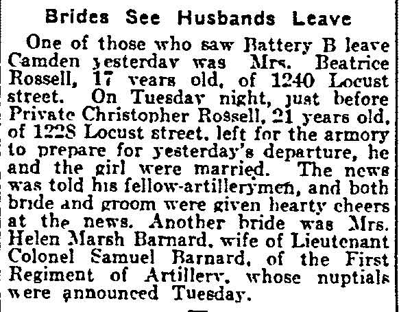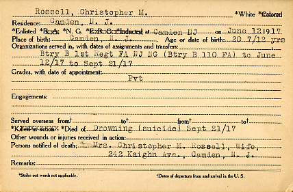 PRIVATE CHRISTOPHER M. ROSSELL was born in Camden, New Jersey in 1898. He enlisted in the New Jersey National Guard at Camden on June 12, 1917. He was assigned to Battery B, 1st Regiment Field Artillery, which was later reorganized as Battery B, 110th Field Artillery Regiment, and on September 12, 1927 as Battery B, 110th Field Artillery Regiment. On July 24, 1917 Christopher Rossell and his 17-year old sweetheart Beatrice were married. They both had been living in the 1200 block of Locust Street, Beatrice at 1240 and Christopher at 1228. Private Rossell committed suicide by drowning on September 27, 1917. He was survived by his wife, who was then living at 242 Kaighn Avenue. |