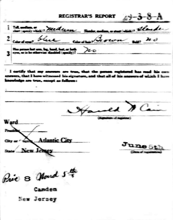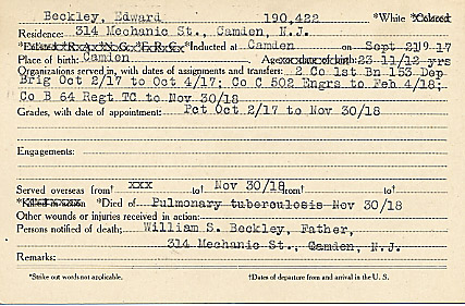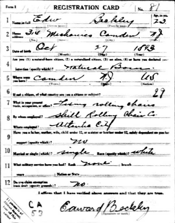 draft in Atlantic City, New Jersey on June 5, 1917. Called up in November 1917,