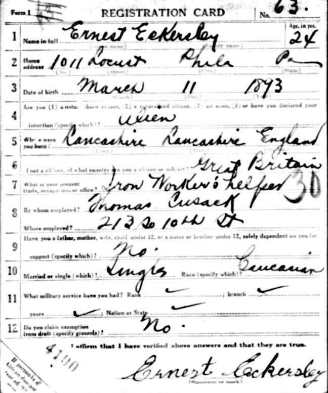 PRIVATE ERNEST ECKERSLEY was born in Farnworth, Lancashire, England on March 11, 1893 to David and Ann Eckersley. Last residing in Farnworth, Ernest Eckersley came to America with his mother and sister Helen on the steamship Bergenland, sailing from Liverpool for Philadelphia on January 23, 1901, to join his father in North Camden. His father had come before them, and lived at 537 North 10th Street when his family arrived in America. The Eckersley family lived at a widow, Mrs. Ellen Van Hart, at 1005 Penn Street in Camden NJ. They had had moved to 719 North 9th Street by the time America entered the War. By June of 1917 Ernest Eckersley had moved to 1011 Locust Street in Philadelphia PA. He worked as an iron worker and helper for Thomas Cusack of 213 South 10th Street, Philadelphia PA, and was unmarried when he registered for the draft on June 5, 1917. Ernest Eckersley was rejected three times for enlistment in the United States Army and finally went to the Canadian Recruiting Mission in Philadelphia, where he was accepted. He was assigned to a British Army unit, the Lancashire Fusiliers. Private Ernest Eckersley was killed in action during the Battle of the Ancre, on April 5, 1918. He was survived by his father and sister. His father was still lodging with Mrs. Van Hart as late as April of 1930, at 714 North 9th Street in North Camden. Private Eckersley is memorialized at the Arras Memorial in Arras, France The Arras Memorial is in the Faubourg-d'Amiens Cemetery, which is in the Boulevard du General de Gaulle in the western part of the town of Arras. The cemetery is near the Citadel, approximately 2 kilometers due west of the railway station. The Memorial commemorates almost 35,000 casualties of the British, New Zealand and South African Forces who died between Spring 1916 and 7th August 1918, with the exception of casualties of the Battle of Cambrai in 1917, and who have no known grave. The design, by Sir Edward Lutyens, consists of a cloister, 25 feet high and 380 feet long, built up on Doric columns and faces west. In the broader part of the site the colonnade returns to form a recessed and open court, terminated by an apse in front of which is the Arras Flying Services Memorial. The names of the casualties are carved on stone panels fixed to the cloister walls. |