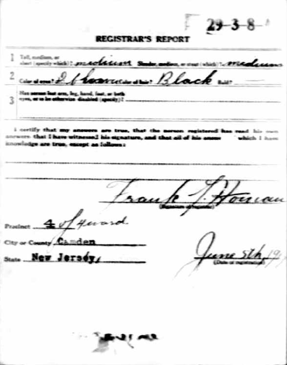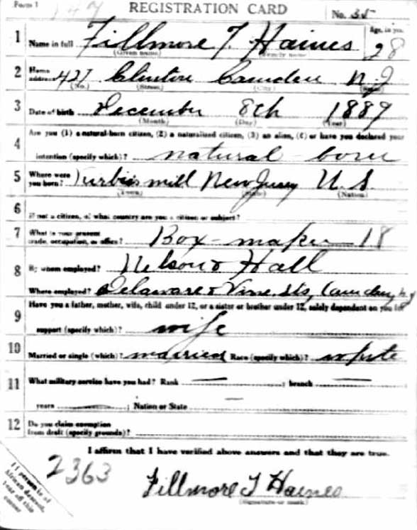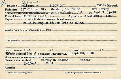 PRIVATE FILLMORE T. HAINES was born in Medford, New Jersey on December 8, 1889, near Kirby's Mill, one of twelve children born to Harvey Gabriel Haines and his wife, the former Lillian Turner. When the Census was taken in June of 1900, only five of the Haines children were living, Fillmore T. Haines being the oldest. His younger siblings were Ada, Lizzie, Walter, and William Haines. When the Census was again taken, in 1910, Fillmore T. Haines was living in Evesham Township on the farm of Thomas Braddock, where he worked as a farm laborer. He came to Camden, New Jersey after the compilation of the 1914 Camden City Directory. When Fillmore T. Haines registered for the draft on June 5, 1917 he was living at 427 Clinton Street in South Camden. He was then working as a box maker. Fillmore T. Haines was inducted into the United States Army on September 3, 1918 and sent to Camp Dix. It was there that he fell victim to the Spanish flu pandemic that had reached America from Europe. Private Fillmore T. Haines died from pneumonia brought on by the flu on September 28, 1918. His father, who was still living in Medford, was notified of his death. Fillmore T. Haines was brought home and buried at Medford Baptist cemetery in Medford Fillmore Haines was a member of the patriotic fraternal organization, the Improved Order of Red Men, belonging to Ottawa Tribe No. 15, which met in Morgan's Hall on Market Street in the years leading up to America's entry into World War I. Ottawa Tribe No. 15 members included J. Richard Geist, Ralph Benner, Burton Bagg, john harkins, Joseph Covert, and William Schucker. |