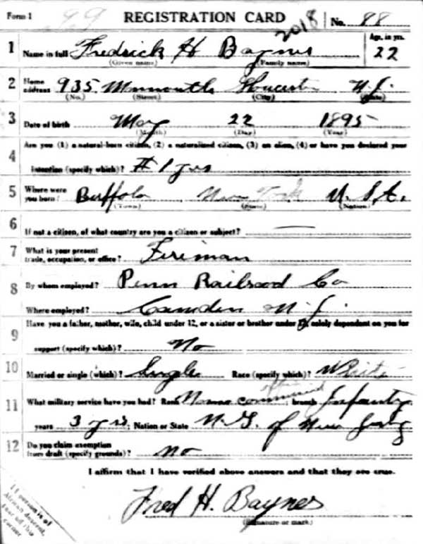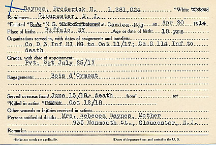 SERGEANT FREDERICK H. BAYNES was born in Buffalo, New York on May 22, 1895 to Frederick H. and Rebecca Baynes. His father worked as an inventor at the Welsbach and General Gas Mantle Co., which produced incandescent gas mantles from the late 1890s to 1941 in Camden and Gloucester City. Welsbach was known as one of the most technologically advanced gas mantle factory in the world in its day. The family lived at 935 Monmouth Street, Gloucester City NJ. Prior to the war Frederick Baynes worked as a fireman for the Pennsylvania Railroad in Camden. He also had served for three years with the old Third Regiment, National Guard of New Jersey, which had its headquarters in the armory at Haddon Avenue and Mickle Street. This building was known after 1954 as Camden Convention Hall. Frederick Baynes had been promoted to non-commissioned officer's rank while serving with the National Guard. Sergeant Baynes registered for the draft in Camden NJ on June 5, 1917. He was sent along with the rest of the Third Regiment to Camp Edge, Sea Girt, on July 25, 1917, and later transferred to Camp McClellan, Anniston AL. He became a member of Company G, when the regiment was reorganized as the 114th Infantry. Sergeant Baynes was killed in action in the Meuse-Argonne offensive on October 9, 1918. He was survived by his parents Frederick H. and Rebecca Baynes of Gloucester City, and a sister Helen Baynes of the same address. The Baynes family family moved to 86 Homer Avenue in Buffalo NY sometime during the 1920s. In 1930 Mrs. Rebecca Baynes took part in the Mother's Pilgrimage to France. |