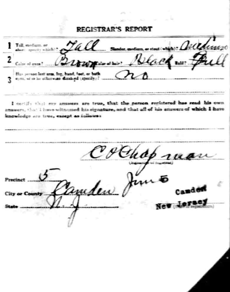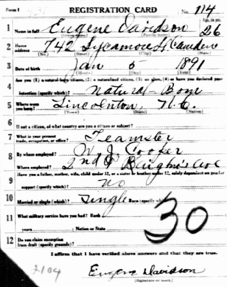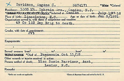 PRIVATE EUGENE DAVIDSON was born January 6, 1891 in Lincolnton NC. His early years were spent there. When the census was taken in 1900 he was living with his aunt Susan Berriner*. They had moved to Philadelphia by the summer of 1910. Eugene Davidson was working as a laborer. Sometime during the 1910s he moved to Camden. He was working as a teamster for the William J. Cooper Company at 215-221 Kaighn Avenue on June 5, 1917- the day he registered for the draft. He was then living at 742 Sycamore Street, and later moved to 1003 Mount Ephraim Avenue. He had moved to 613 Liberty Street when called to service in June of 1918. Private Davidson, who was generally known as "Gean" Davidson died in a local hospital in October of 1918 from Spanish influenza, contracted while on a leave of absence from Camp Dix. Unmarried at the time of his death, he was survived by his aunt, Mrs. Susan Miller, of Philadelphia. |