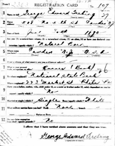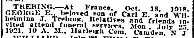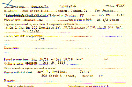 PRIVATE GEORGE EDWARD TREBING was the son of Carl E. and Wilhelmina Trebing. He lived at 508 North 5th Street in Camden NJ, where his father was self-employed as a shoemaker, with a shop at 430 Main Street in the same North Camden neighborhood in which he lived. Carl Trebing had been born in Germany, and was working as a shoe and boot-maker in Camden as early as 1887, and had opened his shop at 430 Main Street in business for himself by 1888. The family was living on the 400 block of Main Street when George was born. When the Census was taken in 1900 they lived at 414 Birch Street. George Trebing registered for the draft in June of 1917. He was then working as a runner for the National State Bank at 223 Market Street. He was drafted on February 25, 1918, at the age of 29. After training at Camp Dix NJ, he was assigned to Company D, 309th Infantry Regiment. He died of wounds on October 19, 1918, in a partially wrecked church at Grand Pre, France that was being used as a hospital. He was charging with his squad when German machine gun fire wounded him in the side. A comrade carried him back to the old church, where he died. George Trebing was survived by his mother and father, and three brothers, Walter A., Carl Jr,, and Harold Trebing. Walter A. Trebing was also a veteran of World War I. The Trebing family was still at the North 5th Street address as late as April of 1930. Carl Trebing Jr. became a dentist, later moving to a home on Marlton Pike near Cornell Avenue in Delaware Township (present day Cherry Hill) NJ. |