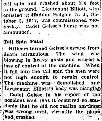 tail spin and failed to regain control of his machine. J.H. Geisse, a