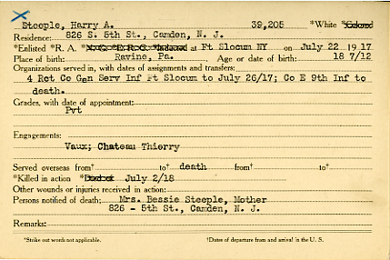 Steeple was killed in a heroic manner at Vaux, France, on July 2, 1918.