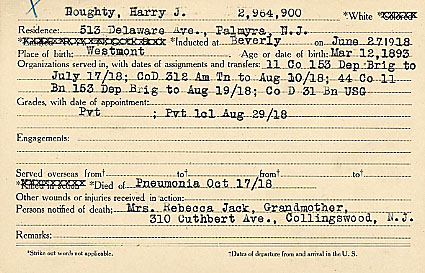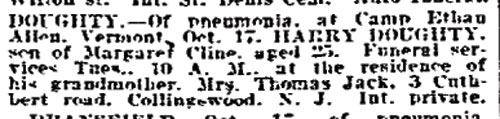 PRIVATE FIRST CLASS HARRY J. DOUGHTY was born in the Westmont section of Haddon Township, New Jersey on March 12, 1893. He was raised by his widowed grandmother, Mrs. Rebecca Jack on Cuthbert Road in Haddon Township. When Harry J. Doughty registered for the draft on June 5, 1917 he was living in Palmyra, New Jersey. He was then working as a trolley car motorman for the Southern Pennsylvania Traction Company in Chester, Pennsylvania. Harry Doughty was single at that time, and had not married when he was called up in June of 1918 at Beverly, New Jersey. Harry J. Doughty was inducted into the United States Army in Beverly, New Jersey on June 27, 1918. Initially assigned to the 153 Depot Brigade at Camp Dix, Private Doughty served with the 312th Ammunition Train from July 18 to August 10, 1918. He was returned to the 153 Depot Brigade little more than a week, then transferred to Company D, 31st Battalion of U.S. Guards. The United States Guards were a formation of the United States Army created to guard strategic installations and areas in order to free infantry regiments for war service during World War I. The Guards were created on 22 December 1917 and were controlled by the Chief of the Militia Bureau. They eventually comprised 48 battalions of men who were either too old or physically unfit for active service. Private Harry J. Doughty was sent to camp Ethan Allen in Vermont to join his new unit. He was promoted to Private First Class on August 29, 1918. Private Doughty became a victim of the Spanish Flu pandemic that reached America in the fall of 1918. He died of pneumonia at Camp Ethan Allen on October 17, 1918. Funeral services were held for Private First Class Doughty at the home of his grandmother, Mrs. Rebecca Jack, 310 Cuthbert Avenue, Haddon Township, New Jersey. |