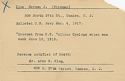 FIREMAN FIRST CLASS HERMAN JOHN KING, of 208 North 37th Street, Camden, New Jersey, lost his life when the collier USS Cyclops was sunk on June 14, 1918. The loss of the ship and 306 crew and passengers without a trace sometime after 4 March 1918 remains the single largest loss of life in U.S. Naval history not directly involving combat. The cause of the ship's loss is unknown. Herman John King was born in Camden, New Jersey in March of 1893, the second four children belonging to Susannah and Arno King. Arno King worked as a stone mason and after 1914 later as a carpenter. The family lived at 828 Lawrence Street as late as 1894. By 1898 the family had moved to the house on North 37th Street in what was then the Town of Stockton. In 1899 Stockton was merged into Camden Herman John King enlisted in the United States Navy at Indianapolis, Indiana on March 4, 1917. After receiving his initial training he was assigned to the USS Florida, then transferred to the USS Cyclops. Herman King was survived by his parents, brother, and sisters, of the North 37th Street address. He was 24 years old when he was killed. |