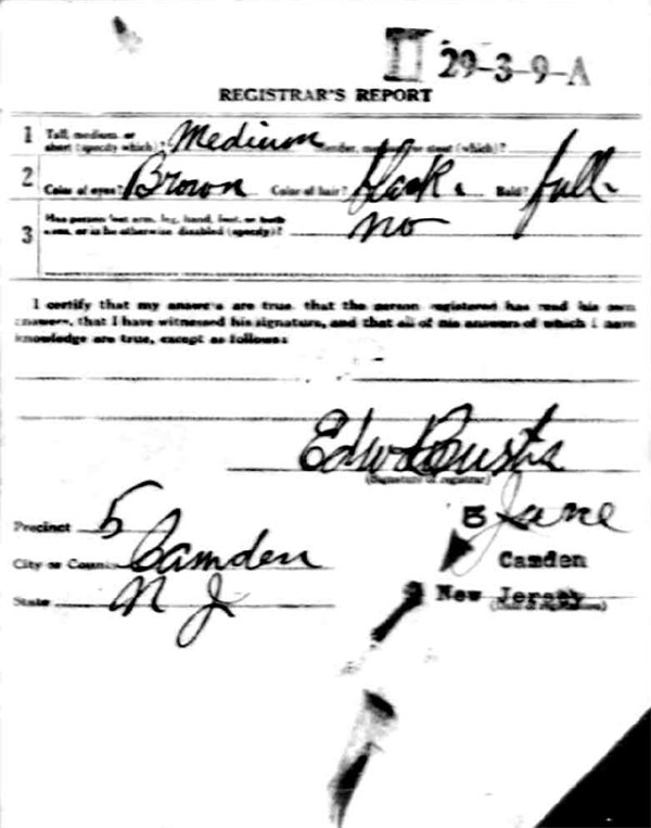 registered for the draft in Camden on June 5, 1917 and was called up on April