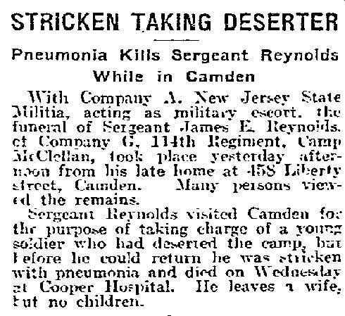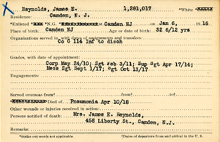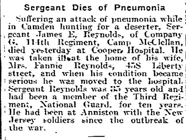 SERGEANT JAMES E. REYNOLDS was born in New Jersey around 1882. When the Census was taken in 1910 he lived with his wife, the former Fannie C. Hartwell, at 1229 South 3rd Street, just south of Kaighn Avenue in Camden NJ. He was then working as a glass blower in a glass factory. Later during the 1910s the couple moved around the corner to 458 Liberty Street. , James Reynolds had been a member of the 3rd Infantry Regiment, New Jersey National Guard, for years prior to America�s entry into World War I. He left with the regiment for Camp Edge at Sea Girt NJ in July of 1917, and was sent to Camp McClellan at Anniston AL when the unit was moved there. He was assigned to Company G when the 3rd Regiment was reorganized as the 114th Infantry Regiment. In the Spring of 1918, Sergeant Reynolds returned to the Camden area to apprehend a deserter. The deserter was apprehended in Riverton NJ. While in the area, Sergeant Reynolds was taken ill, and he died of pneumonia at Cooper Hospital on April 10, 1918. He was survived by his wife and mother-in-law, Hannah M. Hartwell. |