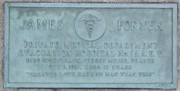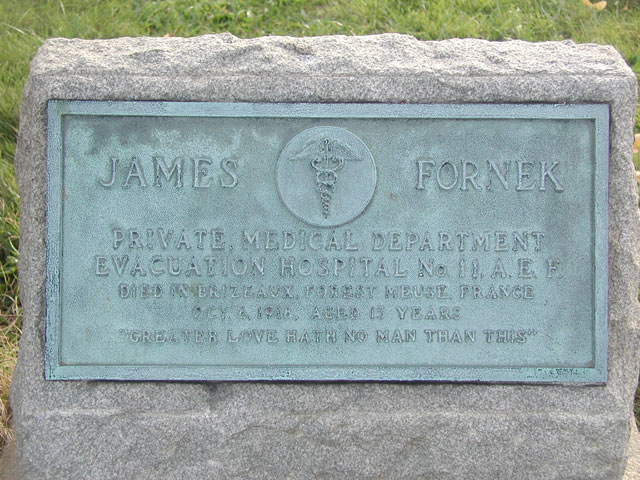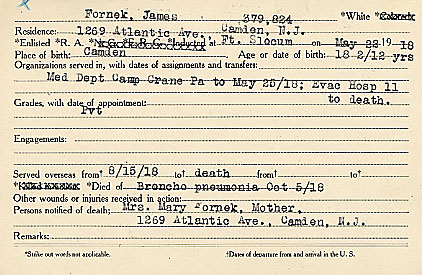 PRIVATE JAMES FORNEK of 1269 Atlantic Avenue, Camden NJ, died in France on October 6, 1918 while serving with the United States Army. James Fornek was the son of Ignatius and Mary Formanek. The couple had come to America from a Polish-speaking part of Germany in 1884 and 1886 respectively, and married here around 1887. Daughter Josephine was born in March of 1888. She was followed by Mary, John, Mollie, and Albert. When the Census was taken in 1900 the family was living at 1133 Louis Street in Camden, a neighborhood where many of Camden's first Polish immigrants resided. James Fornek was born in 1902. Although Army records indicate that James Fornek was 18 when he enlisted, it appears that he lied about his age to get into the Army, and that he was at best 15 years of age. Older brother John F. had served in the Navy in the 1900s and early 1910s, and went overseas with the 29th Infantry Division, and another brother, Joseph, had also registered for the draft. Calling himself James Fornek, he entered service on May 22, 1918, and was sent to Camp Crane at Allentown PA, where he was assigned to Evacuation Hospital Number 11. He went overseas with this unit in August of 1918. Private Fornek fell victim to the Spanish flu pandemic that caused millions of deaths around the world in the fall of 1919. He died due to bronchial pneumonia, at the age of 15. Private James Fornek was brought home and eventually buried at Calvary Cemetery in Delaware Township (present-day Cherry Hill) NJ. Camden County in the Great War states that he was the son of Mrs. Mary Fornek. He was survived by his mother and brothers. The Formanek family was still in Camden, in the 900 block of Tulip Street, as late as 1947, operating a roofing business as Formanek & Sons. A nephew, Alfred J. Formanek, served in the Air Corps during World War II, was taken prisoner when his bomber went down in Europe, and came home at war's end. |