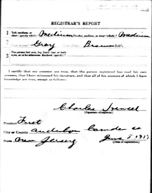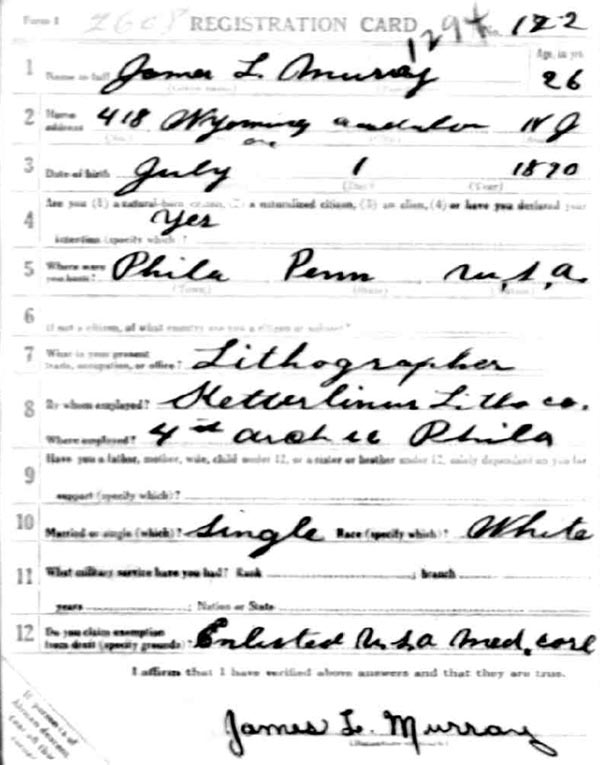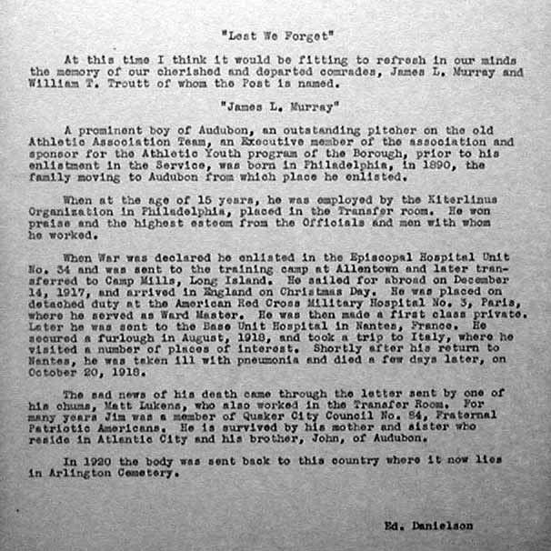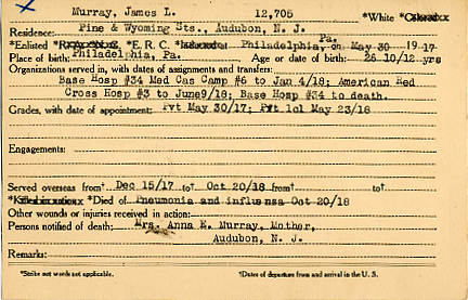 PRIVATE JAMES L. MURRAY was born July 1, 1890 in Philadelphia PA. He and his family later moved to Audubon NJ. He had been a member of the Logan Memorial Presbyterian Church at 2 West Merchant Street in Audubon. James L. Murray was a lithographer by trade, and worked in Philadelphia PA for the Ketterlinus Lithograph Company at 4th and Arch streets. He enlisted in the United States Army Medical Corps on May 30, 1917 but had not reported on June 5th when he registered for the draft. Soon afterwards he was sent to camp at Allentown PA for training in the United States Army Ambulance Corps. Private Murray served as an ambulance driver during the Battle of Belleau Wood and the bombardment of Paris. He arrived in France on December 23rd, 1917. Private James L. Murray died of pneumonia at Red Cross Military Hospital, No. 3, Paris, on October 20, 1918. He was survived by his mother, Mrs. Anna E. Murray, a sister, Blanche P. Murray, and a cousin, Frank S. Boya. The Murray-Trout American Legion Post 262 in Audubon NJ is named in part for him. |
