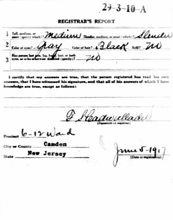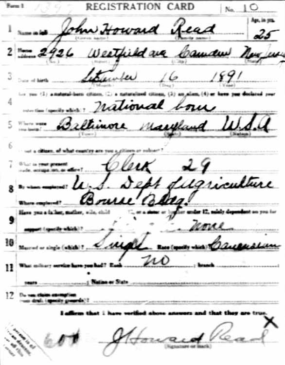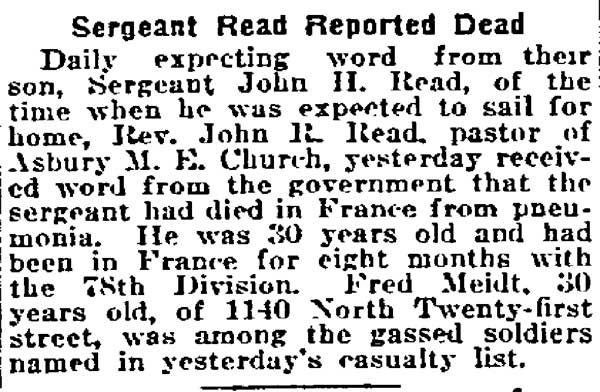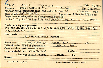 SERGEANT MAJOR JOHN HOWARD READ was born in Baltimore, Maryland on September 16, 1891. He was the son of Rev. John R. Read and his wife Laura. John Howard Read was known as and signed his name as J. Howard Read. He and his family came to Camden after the compilation of the 1906 City Directory. Reverend Read and his family were living in Camden by the spring of 1910, living at 635 South 3rd Street. He was then pastor of the Wiley Methodist Episcopal Church at South 3rd and Beckett Streets. By 1914 the family had moved to 2926 Westfield Avenue when Reverend Read became the pastor of the Asbury Methodist Episcopal Church in East Camden. J. Howard Read lived at 2926 Westfield Avenue and was working as a clerk with the United States Department of Agriculture at the Bourse Building in Philadelphia when he registered for the draft on June 5, 1917. He was drafted into the United States Army on February 27, 1918. Sent to Camp Dix NJ, J. Howard Read, who also had skills as a stenographer, was immediately attached to the headquarters of the 78th Infantry Division. According to the book "Camden County in the Great War", he was promoted to Battalion Sergeant Major in June of 1918, just before the Division sailed for France. He was promoted to Regimental Sergeant Major once in France. Sergeant Major J. Howard Read survived the fighting in France, only to fall victim to the Spanish flu pandemic that killed millions world-wide in 1918 and 1919. Sergeant Major Read died of pneumonia in France on February 27, 1919. |