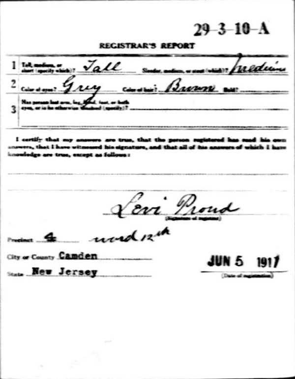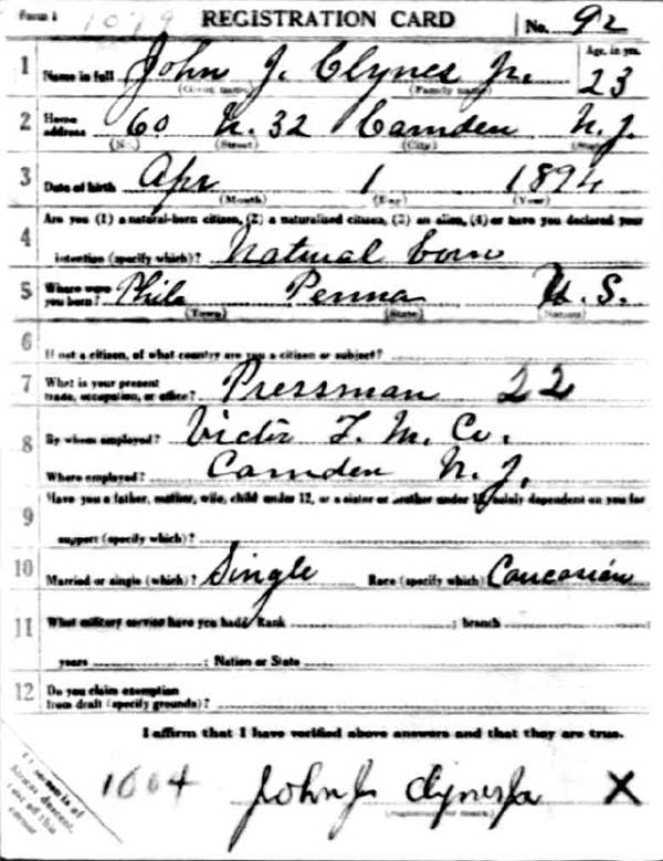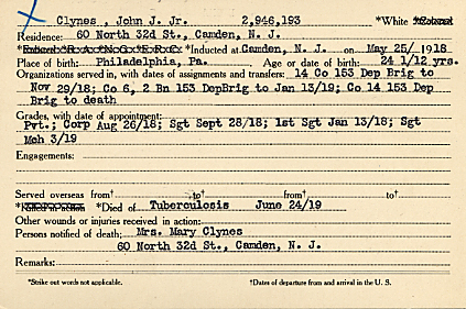 SERGEANT JOHN JOSEPH CLYNES born on April 1, 1894 in Philadelphia, Pennsylvania, the son of John and Mary Clynes, both of whom had been born in Ireland. The family had moved to New Jersey by February of 1900, when brother James was born. Three other children had been born in Philadelphia, sisters Mary and Katie, and brother Thomas. The Clynes family then was renting an apartment at 1565 federal street in East Camden. When the 1910 Census was taken, the Clynes family had bought a home at 60 north 32nd street in East Camden. John Clynes Jr., then 16, had gone to work in a printing office. He was still working as a pressman in June of 1917, when he registered for the draft. At that time he was an employee of the Victor Talking Machine Company factory, His father was by then a foreman at one of the leather factories in Camden. Drafted on May 2nd 1918, John Joseph Clynes was sent to Camp Dix NJ and assigned to the 4th Company, 4th Battalion, 153rd Depot Brigade as a private. He was subsequently promoted to corporal and then to sergeant. While stationed at Camp Dix, Sergeant Clynes contracted tuberculosis. He was sent to Base Hospital No. 8 at Otisville NY, where he passed away on June 24, 1919. He was 25 at the time of his death. John Joseph Clynes was survived by his parents, brothers Thomas and James, and sisters Catherine and Margaret. The family still resided on North 32nd Street into the 1920s, but had moved by April of 1930. His brother James stayed in the area. Last a resident of Cherry Hill, he died in November of 1969. |