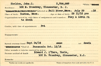 PRIVATE JOHN J. SHELDON was the son of Louis and Mary Sheldon. The Sheldon family resided at 100 North Broadway in Gloucester City NJ. He was drafted on July 29, 1918, and sent to the Syracuse Recruit Camp in Syracuse NY, where he was assigned to Battery A, 126th Field Artillery. Private John J. Sheldon died of pneumonia on October 13, 1918 at the Syracuse Recruit Camp in Syracuse NY. He was survived by his parents. |