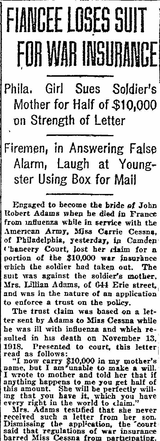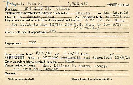 Camden County in the Great War, Private Adams was a member of the 303rd Trench Mortar