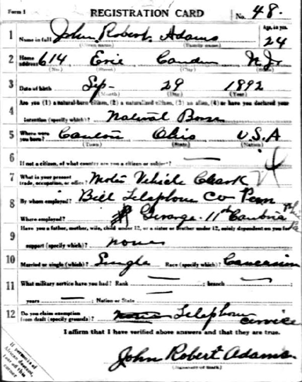 was born in Canton, Ohio on September 29, 1892. When he registered for the draft