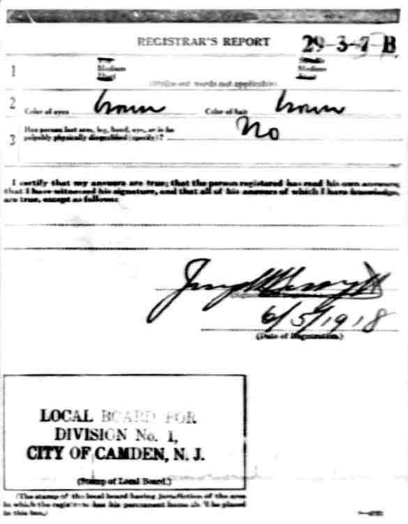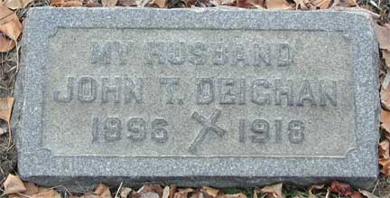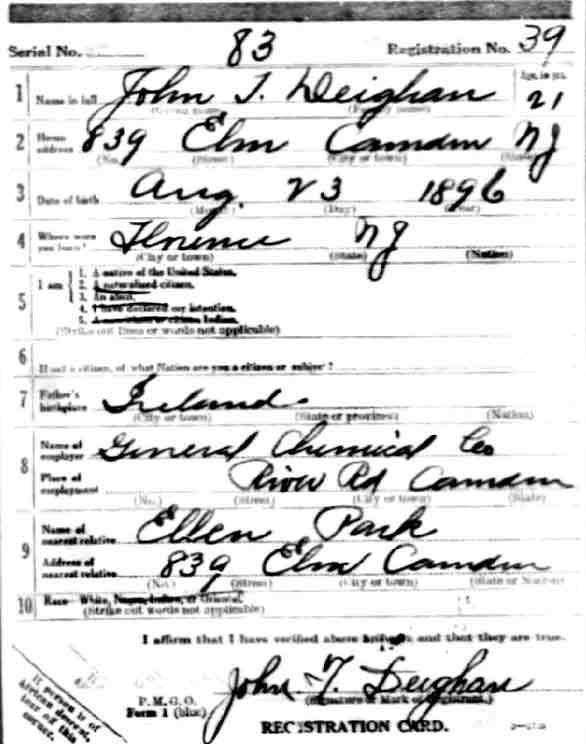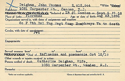 PRIVATE JOHN T. DEIGHAN was a member of a prominent Camden family. Born in Florence, New Jersey on August 23, 1896, his family came to North Camden when he was a boy. John T. Deighan was married and living with his wife Catherine Deighan at 1031 Carpenter Street in the summer of 1918. He was drafted on September 5, 1918, and sent to Camp Humphreys VA, where he was assigned to Company F, 7th Engineers. John T. Deighan was home on leave when he died of Spanish influenza and pneumonia at his mother's house at 839 Elm Street in North Camden on October 12, 1918. He was survived by his wife Catherine, his mother, Mrs. Ellen Deighan Park, his brothers Neil and Richard, his sisters Helen and Sarah, his stepfather William Park, and his stepsisters Elizabeth M., Catherine C., and Agnes V. Park. After funeral services in Camden he was buried with full military honors at Calvary Cemetery in Delaware Township (present day Cherry Hill) NJ. John Deighan's brother Neil F. Deighan operated a popular nightclub and restaurant near the Airport Circle in Pennsauken NJ during the 1920s, 1930s, and 1940s. Neil F. Deighan was also a well known sports figure in Camden. He played professional basketball and was a member of the Eastern Basketball League's 1919-1920 champion Camden Crusaders, which were owned by Camden veterinarian Dr. Charles B. Helm. Rich Deighan also had a long career as a professional basketball player in the 1920s and 1930s. |