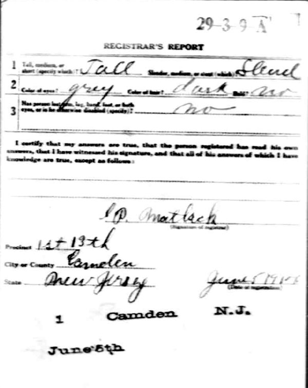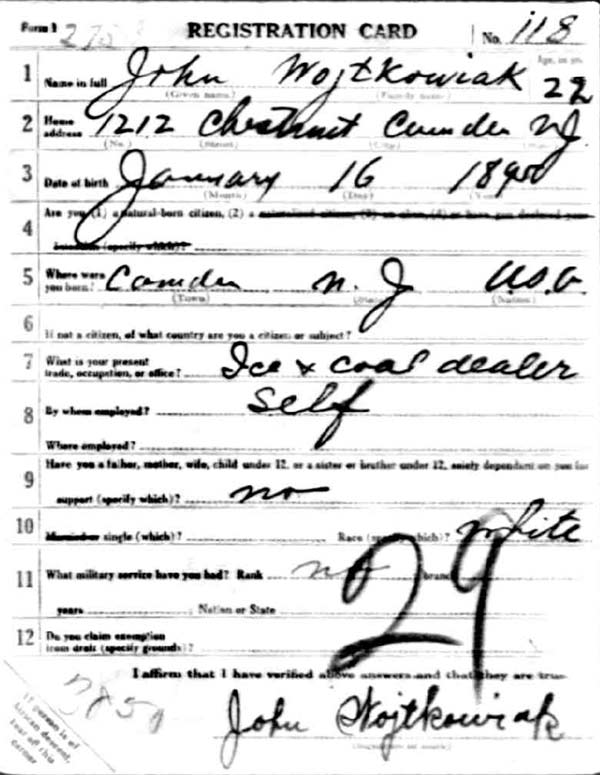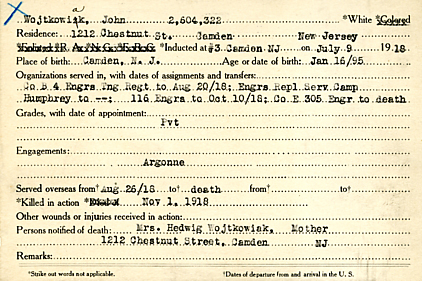 PRIVATE JOHN WOJTKOWIAK was born January 16, 1895 in Camden, NJ. He was one of eight children, seven of whom were born in Camden. His parents, John L. Wojtkowiak and Hedwig (Jadwiga) Sobus-Wojtkowiak and their eldest child Victoria came to the U.S. in 1884 into the Port of New York on the ship AMERICA. from Poland. Also aboard were two of John L.'s brothers, Andrew and Adalbert and his wife Marianna and their son Ladislaus. The Wojtkowiak family was living at 1225 Chestnut Street as early as 1888, working as a laborer, according to the city directories of the day. The family was living at 1210 Chestnut Street at the time of the 1900 Census, and later moved to of 1212 Chestnut Street in Camden NJ. John L. Wojtkowiak was one of the founding members of the predominantly Polish St. Joseph�s Roman Catholic Church, located at South 10th and Mechanic Streets. John Wojtkowiak registered on June 5, 1917 at local board #3 in Camden NJ. Records from that year report John Wojtkowiak's occupation as "iceman." He is described as having grey eyes, dark complexion, weighing 137.5 lbs., and 60 inches in height. He was single. Private Wojtkowiak is said to have been studying for the priesthood when called to active duty on on July 9, 1918. After arrival at Camp Humphreys VA, he was transferred to Company B, 4th Engineers Training Regiment. On August 20, 1918 he was assigned to the Engineers Replacement Service Corps, and then to the 116th Engineers. Once in France he was sent to the Company E, 305th Engineers, 80th Infantry Division Private Wojtkowiak was killed in action on November 1, 1918 neat St. Georges, France, near the Meuse River during the Argonne fighting. A victim of enemy artillery fire, he died instantly. John Wojtkowiak was survived by his parents and a large extended family. He is buried in France. His name is also engraved on his parents' gravestone, a large cross in section A of Calvary Cemetery, Cherry Hill, NJ. The Laskowski-Wojtkowiak Post #74 American Legion of Camden NJ, founded in 1928 and which stood for many years at the corner of Louis and Liberty Streets in Camden, was named in part for him. This Post now shares quarters with the Polish Army Veterans in a building on Mount Ephraim Avenue in Camden NJ. |