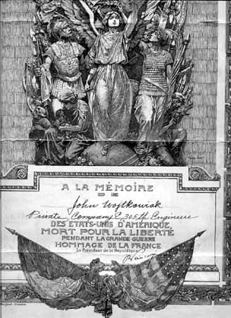 This memorial to Private John Wojtkowiak was created with the help of his great-niece, Sandy White-Grear, using data compiled by great-niece Chris White and Connie Wojtkowiak-Wilke. |